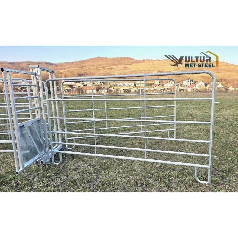 Poartă tip Koral cu 6 bare, realizată din țeavă galvanizată, prevăzută cu prindere rapidă pe bolțuri. Barele sunt dispuse mai des în partea inferioară pentru a preveni ieșirea vițeilor printre ele, asigurând un nivel ridicat de siguranță.